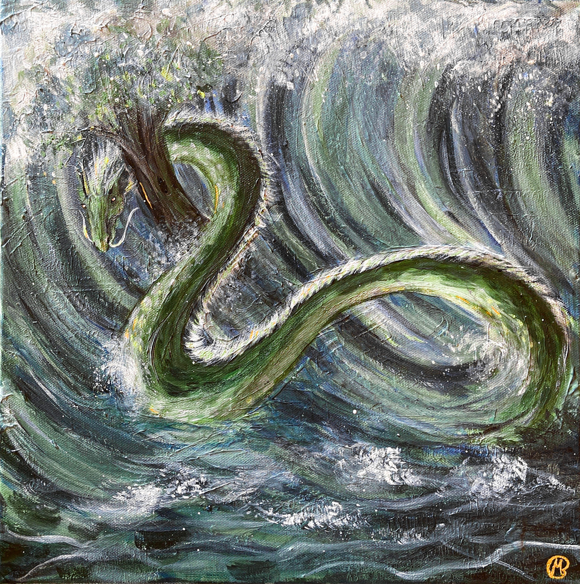Acrylic painting with a sea dragon surfing a wave while holding a tree.