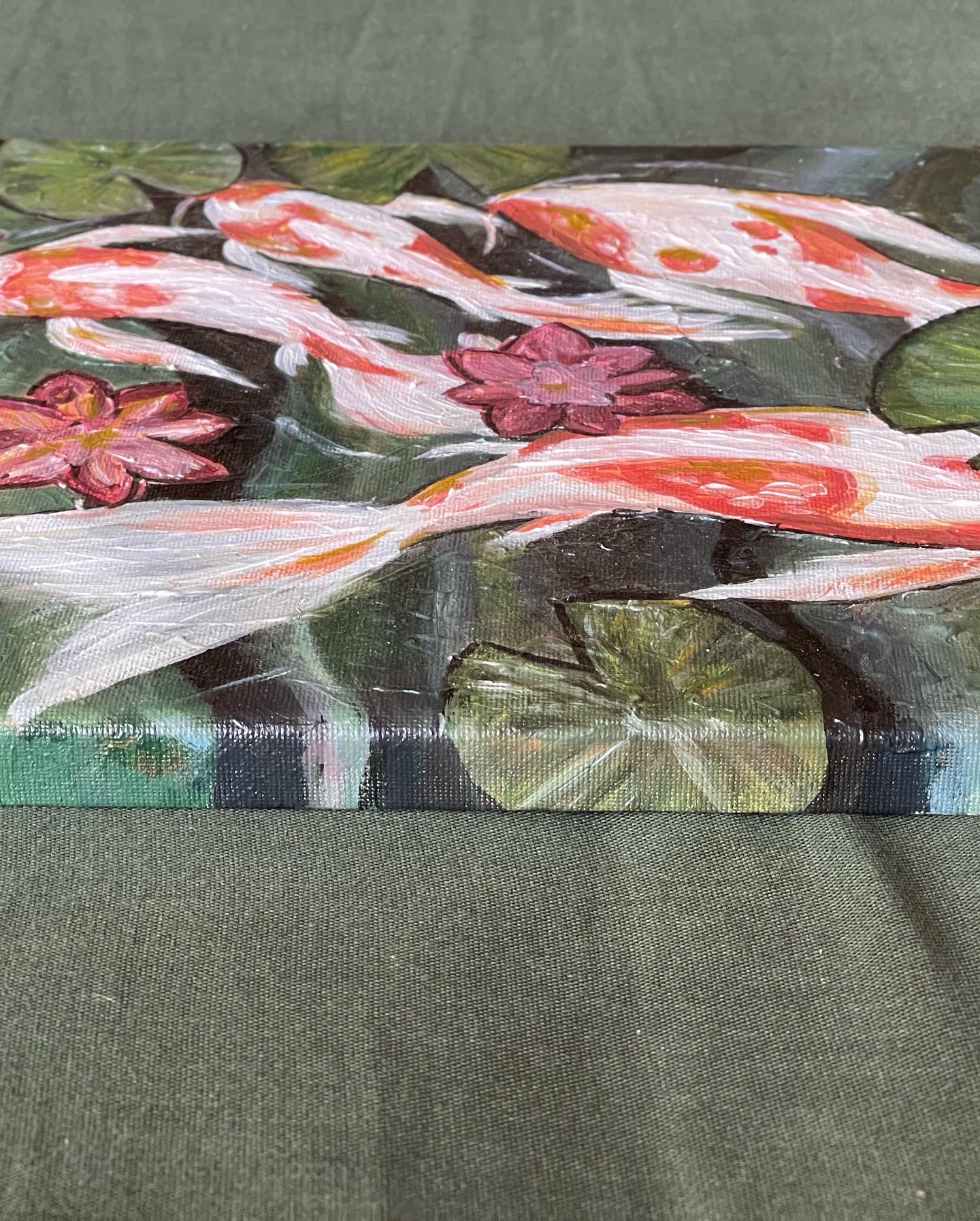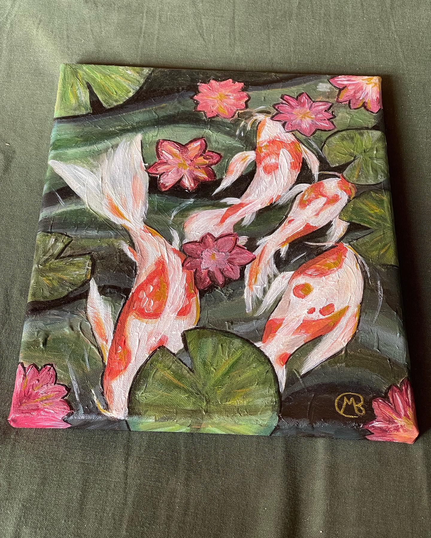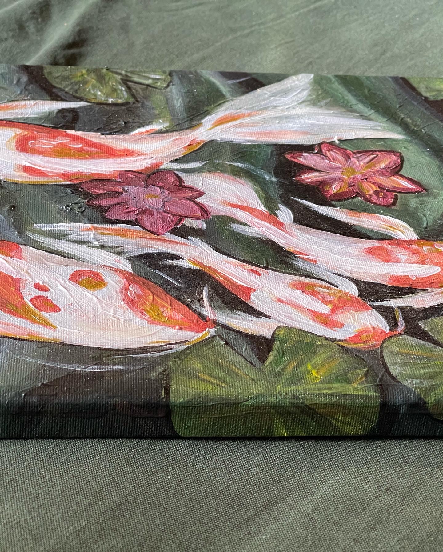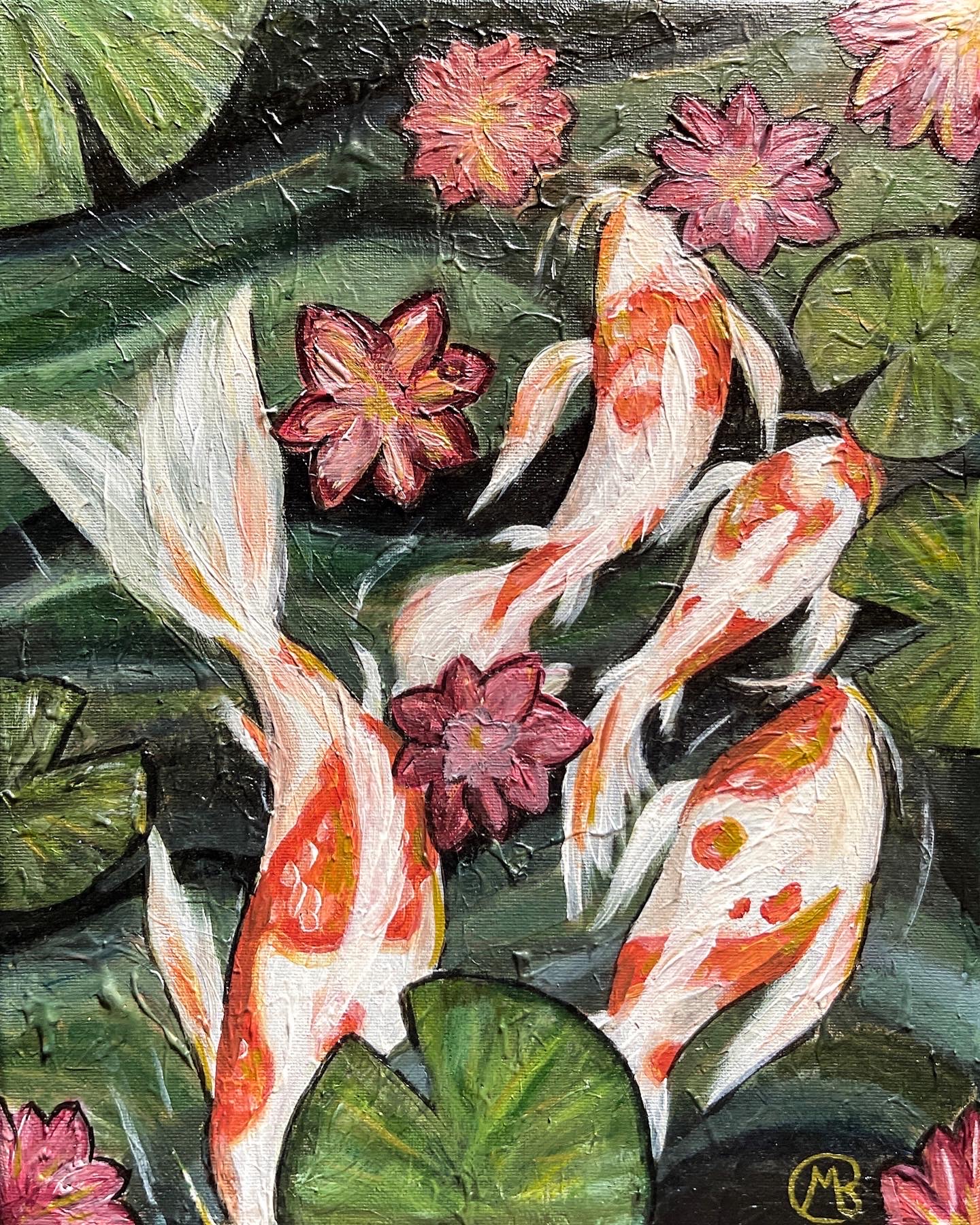 The original acrylic painting with three koi fish or more specifically nishikigoi swimming in a lake.